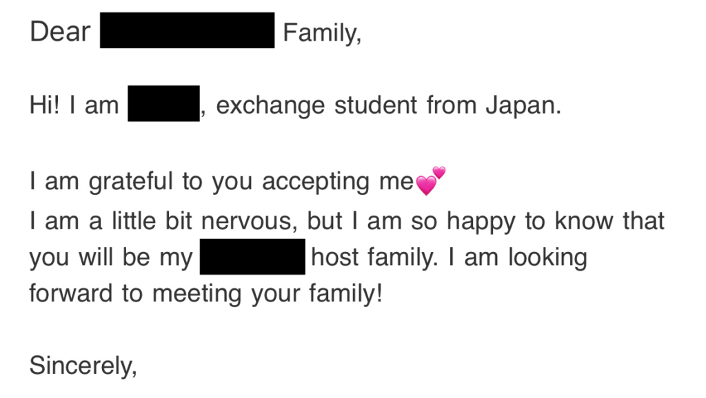 それが「ホストファミリーへの初メール」じゃないでしょうか?